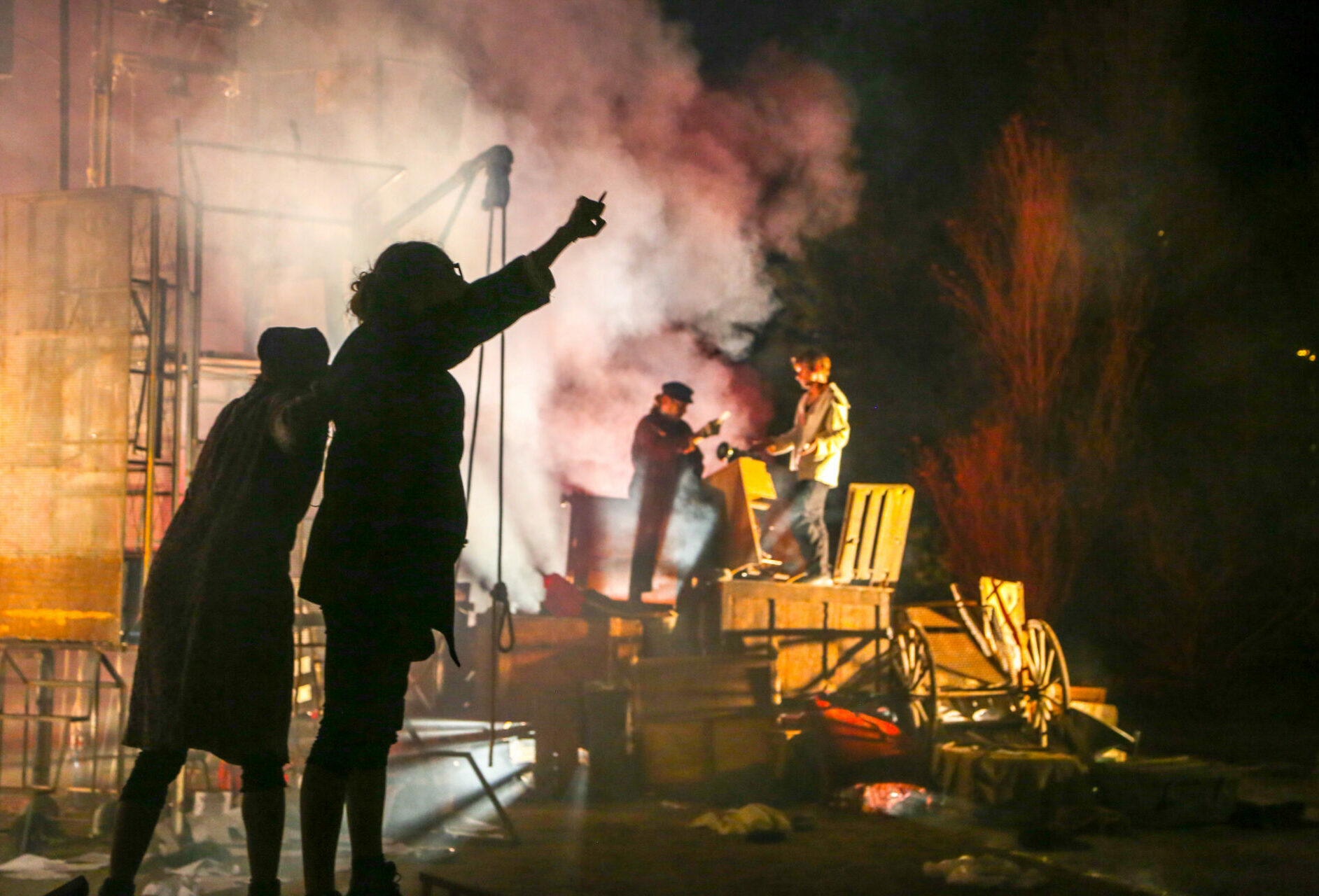 320 litres de bortch, un ver dans la viande, quatre comédiens et autant de bennes Emmaüs auront été nécessaires pour disséquer la flamme de la Révolution, ses images glorieuses, ses instants décisifs, ses dérives sacralisées.