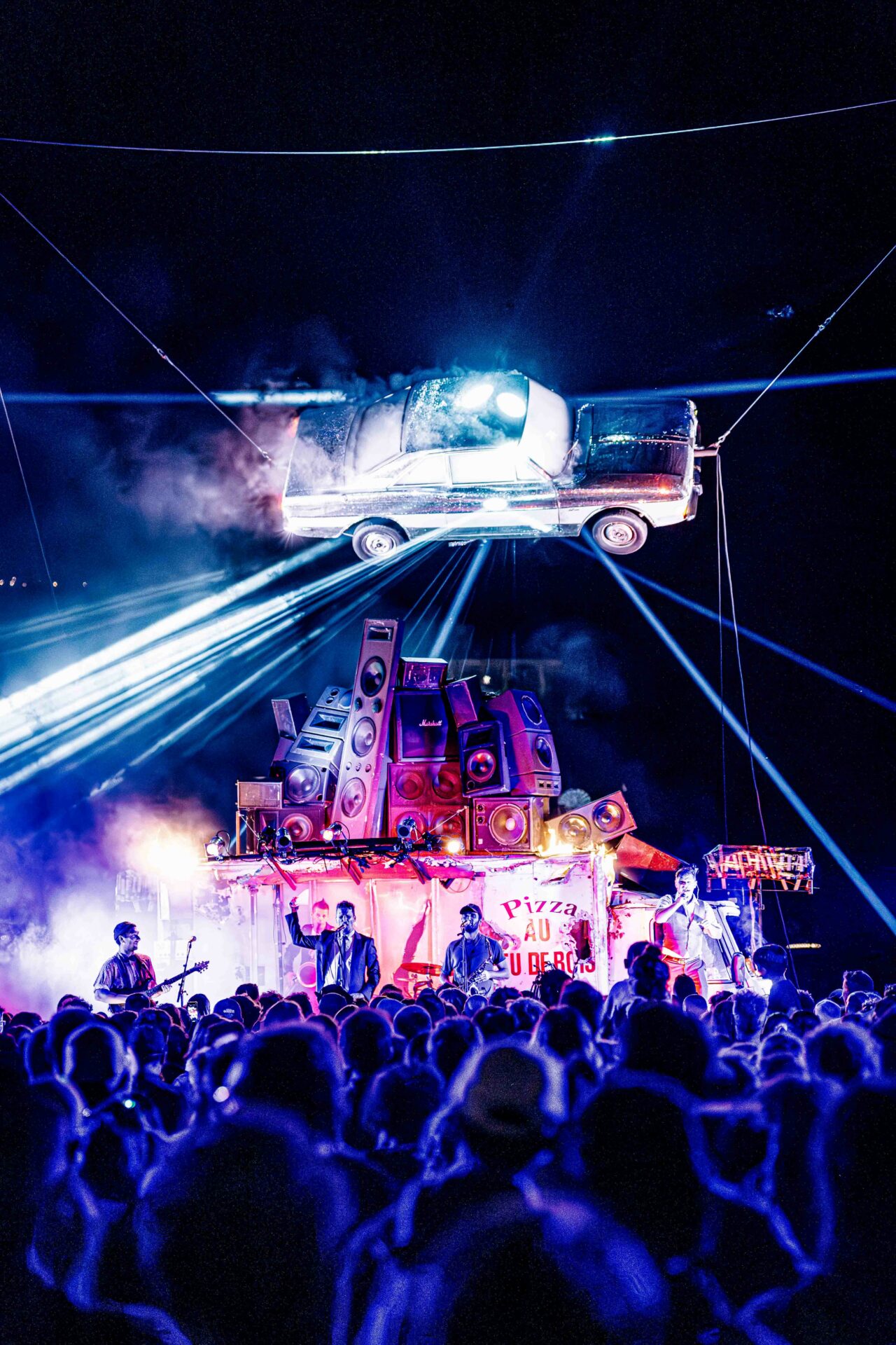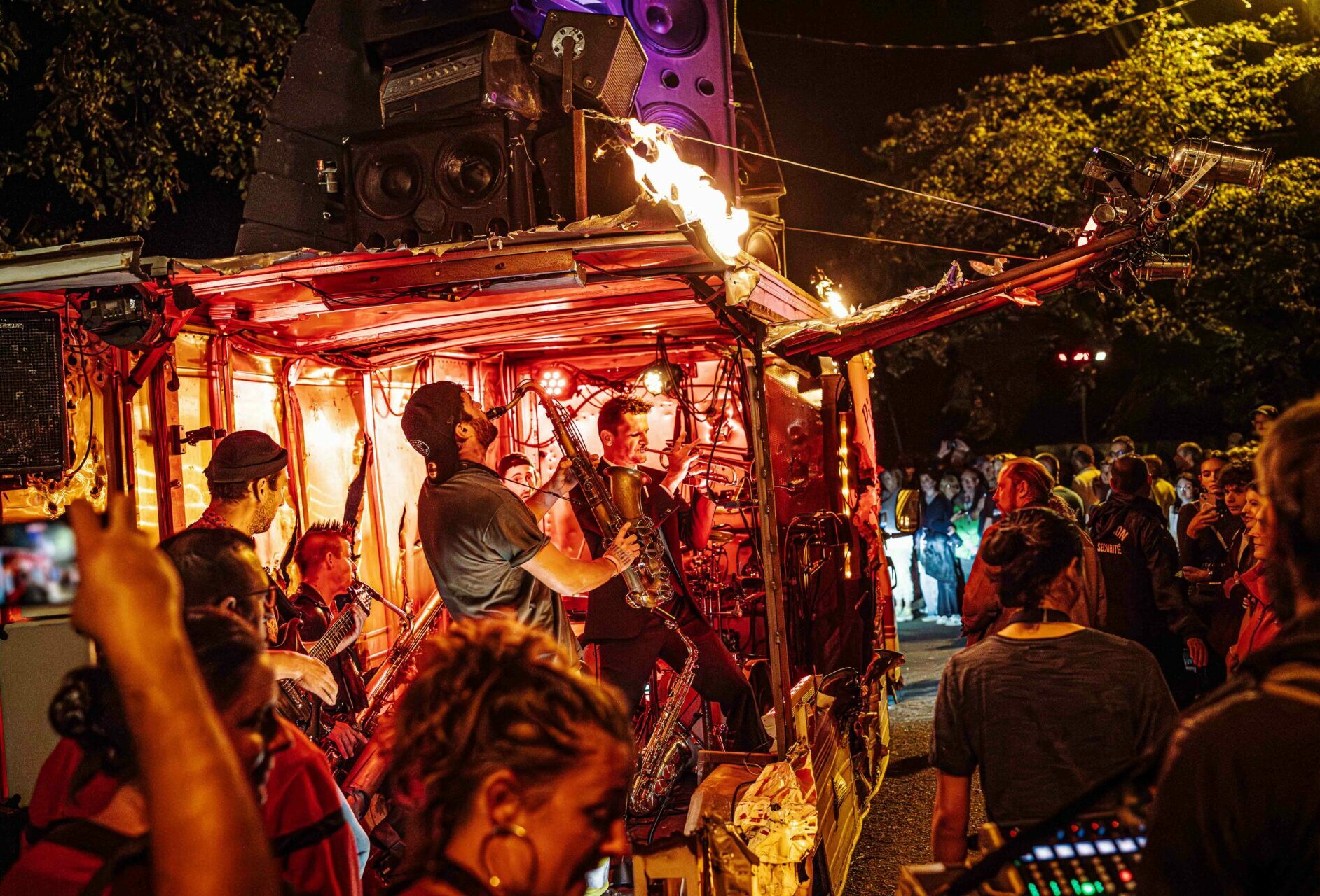 Dans un camion en feu, un groupe surgi de nos plus beaux fantasmes de concert : La Clate, un rock unique et multiple, vif et puissant, festif et définitif. Hors norme par définition, dans le Concert Enflammé on danse sous la Voiture à Facettes : modèle Ford Taunus 1.2 12M 1968 / version jantes à la con, recouverte de dizaines de milliers de facettes. Et pourtant, elle tourne ! Une démesure à échelle humaine, modèle unique au monde garanti. Et pour parfaire la promesse d’une soirée grande comme nos cœurs : pyrotechnie et machines à feu sorties directement de la manufacture Tout En Vrac !
