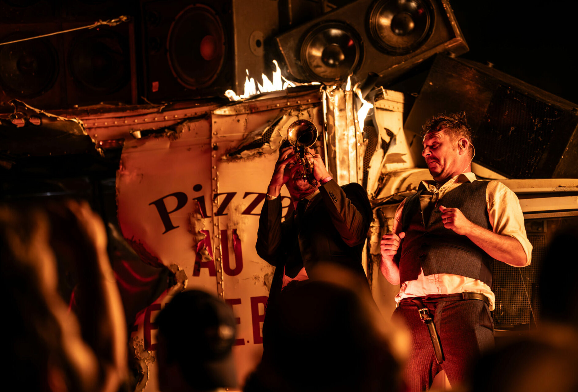 Et si nous dansions sous les artefacts de l’ancien monde ? Peut-être pour célébrer un deuil nécessaire ? Peut-être pour retrouver l’espoir et l’énergie ? De la nécessité d’acter la fin d’une époque pour entrer sereinement et apaisés dans la prochaine. Libérons-nous une bonne fois pour toute de nos démons, de nos contradictions, acceptons le deuil des promesses illusoires par une catharsis collective !